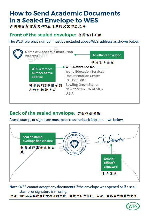 如果你还在读书或没有完成,必须向CHESSIC申请核实学术成绩单,并且你的机构必须向WES发送一封密封的盖章信封,如下图所示。