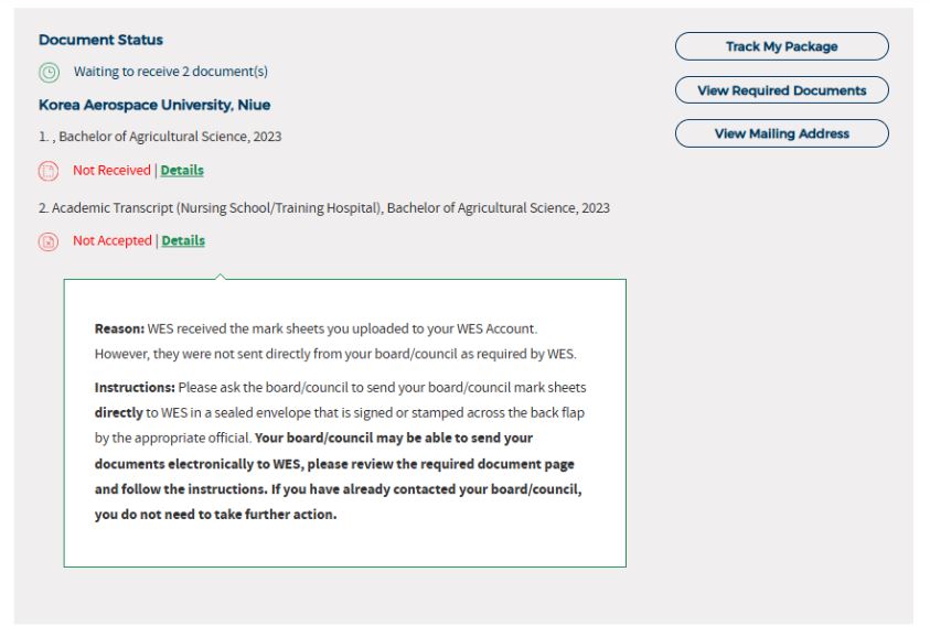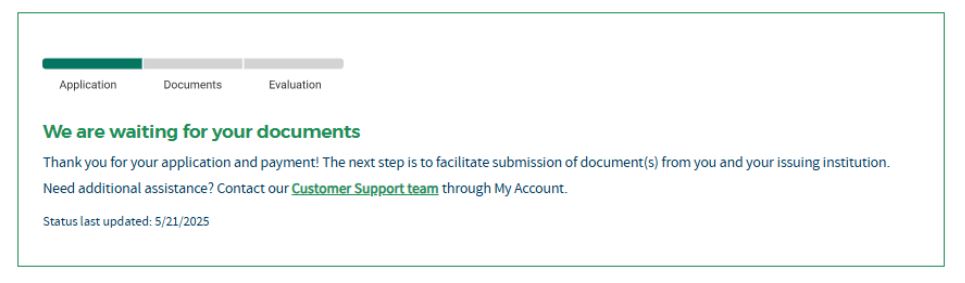 Below the update and description, you will find further instructions that are specific to your evaluation. An example of how this additional information will appear is shown below. Be sure to review this update carefully and click on the “Details” link for the required next steps. You can also follow the “View Required Documents” link to review specific instructions for submitting documents from your issuing institution.