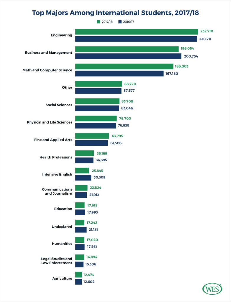 总而言之,工程、商务/管理以及数学/计算机科学最受在美国的国际学生欢迎的三个专业。来自于不同国家的国际学生在专业选择上可能展现出不同的偏好。在决定选择哪一个专业领域的同时,学生还应考虑他们自己的个人兴趣、职业发展道路以及工作许可特权,这些都是有助于您取得成功。