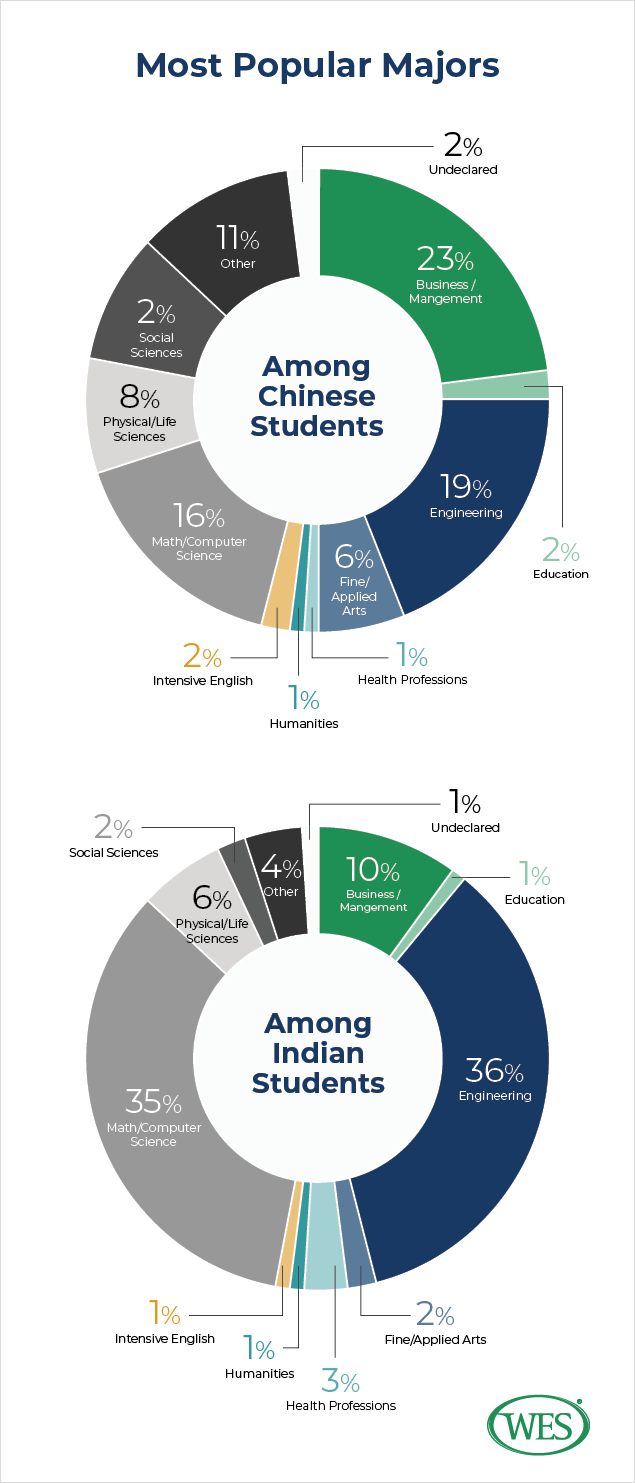 STEM 专业在中国学生之中是最受欢迎的。工程 (19%)、数学与计算机科学 (17.2%) 以及物理生命科学 (8.4%) 合计占中国国际学生学位的 44.6%。商务/管理在中国学生中也占据了一大部分 (20.8%)。全球化趋势下,中国国内对于商务管理专业人员的需求也有所增长。在国际学生中受欢迎的商科专业也从金融、会计和工商管理硕士拓宽到市场营销、商业分析等等。